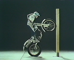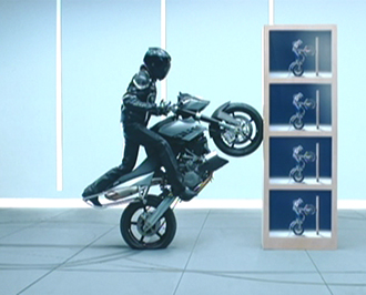 垂れない、しみ込まないが特徴のアロンアルフア「ゼリー状」を題材にしたCMです。垂直に立てられた木の柱に塗られる「ゼリー状」。ウィリーしながら登場するバイク。ここまではこの二者がどう結びつくのか想像できません。ところが、バイクがウィリーしたまま柱に向かっていきます。