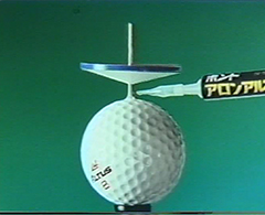 アロンアルフアと硬化促進剤「スーパー液」がセットになった「スーパーセット」を題材したCMです。ゴルフボールの上でまわるコマ。順調に回るコマの回転軸に、アロンアルフアを垂らし、さらにスーパー液を垂らした瞬間…コマがゴルフボールに接着されてストップ!!
