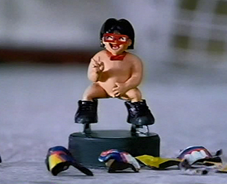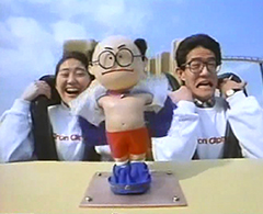 「強いぞ、速いぞ 僕らの味方だ。アロンアルフアがやってきた♪」 軽快な音楽が流れながら、ジェットコースターが急降下をはじめます。ジェットコースターの先頭で風にあおられるマスコット。足元はアロンアルフアで接着されているので落ちることはありませんが、スーツははだけてしまい、ズボンもぬげ、ついにはカツラもとれてしまい・・・。