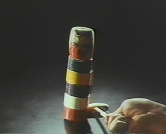 ダルマ落としの胴体部分にアロンアルフアを塗り、テンポよくつみかさねること6段。最後の頭部部分も接着していざダルマ落とし…!! 木槌で打たれた衝撃にも耐え、ダルマはアロンアルフアで接着されたままなのでした。第20回クリオ賞 15秒 TV部門 ファイナリスト賞