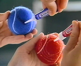 アロンアルフア「ゼリー状」と硬化促進剤「スーパー液」がセットになった「ジャンク(現:スーパーゼリー)」を題材にしたCMです。当時、スーパー液の容器は「赤」、ゼリー状の容器は「青」でした。その容器の色に合わせて、赤いテニスボールと青いテニスボールにそれぞれスーパー液とゼリー状を塗り、2つのボールをプレス機で圧着していきます。果たしてアロンアルフアはテニスボールという反発が強い素材同士でも無事に接着。