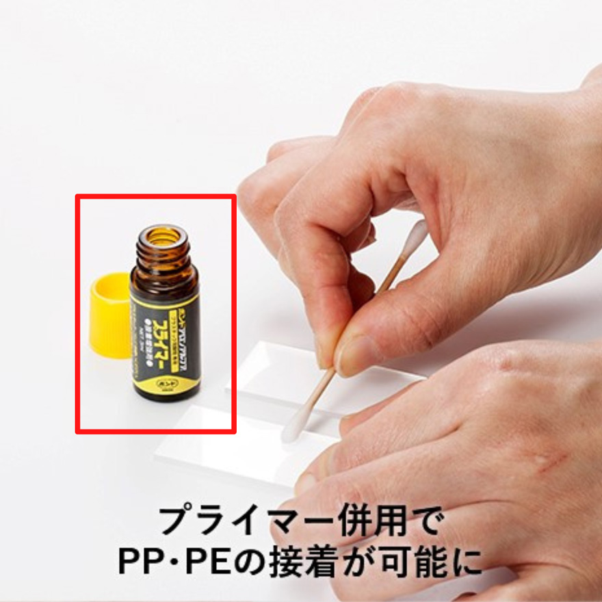 ポリプロピレンやポリエチレンを接着するには、表面に加工を施し、接着剤がなじむようにする必要があります。代表的かつ簡単な方法は、「プライマー」と呼ばれる表面処理剤を塗ってから、接着剤をつけることです。