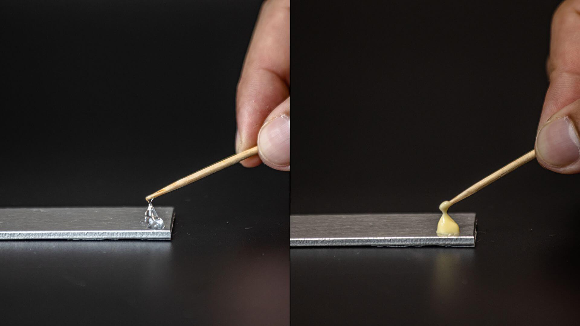 液状のものは下に流れるのに比べて、ゼリー状のものはタレずに付けた場所にとどまります。 垂直面で何かを接着する場合、ゼリー状が便利、というのがよく分かりますね。