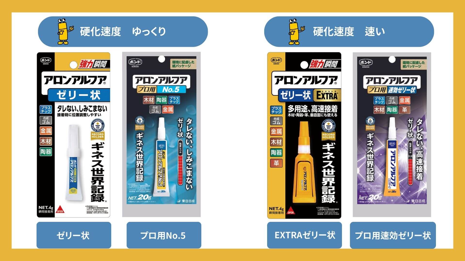 ゼリー状のアロンアルフアの特徴は 粘度が高い タレにくい しみこまない ということ。 液状のアロンアルフアに比べて硬化時間がゆっくりなため、多少の位置調整ができ、もちろん、その接着力は強力です。 また、アロンアルフア EXTRAゼリー状は、押しやすく使いやすいスマート容器を採用。 立てて置くことができるので、液だれの心配もありません。