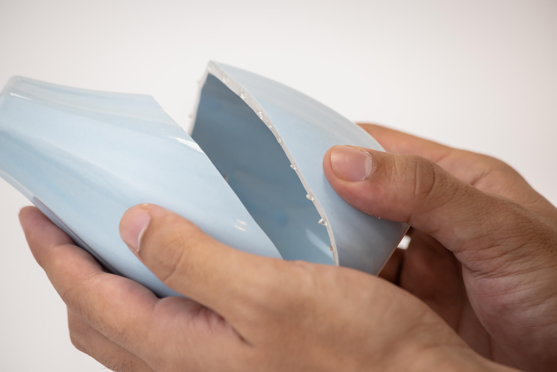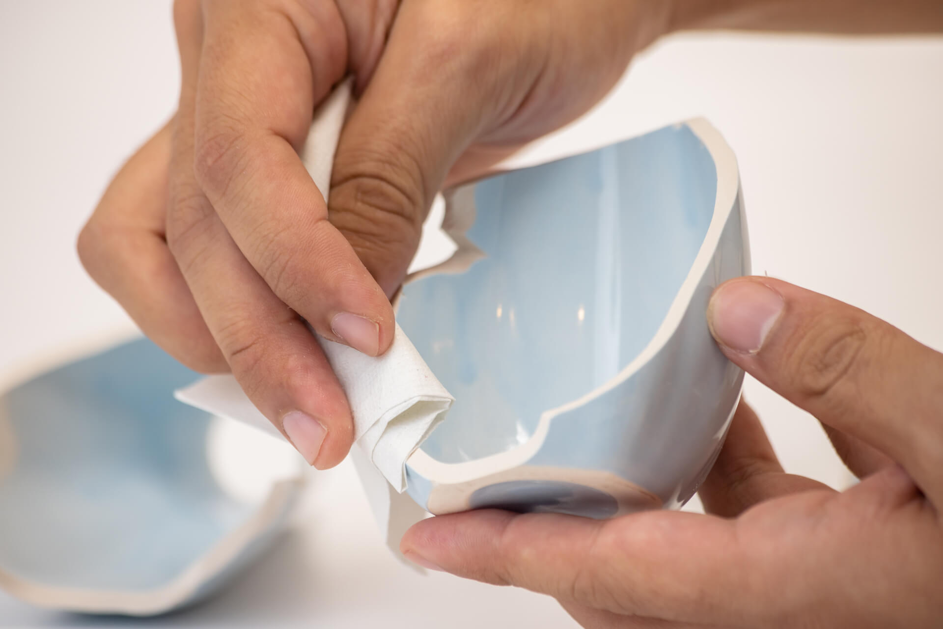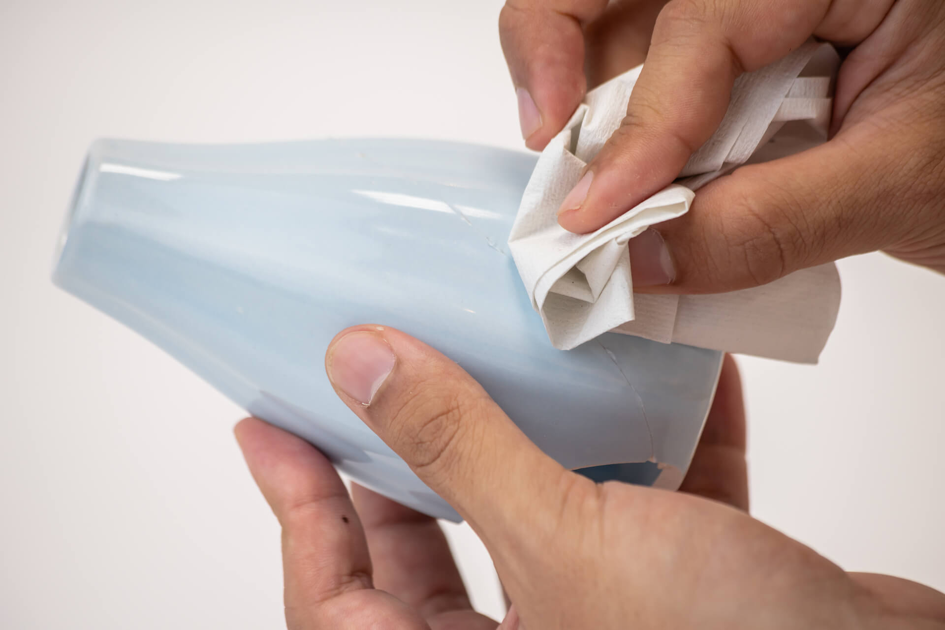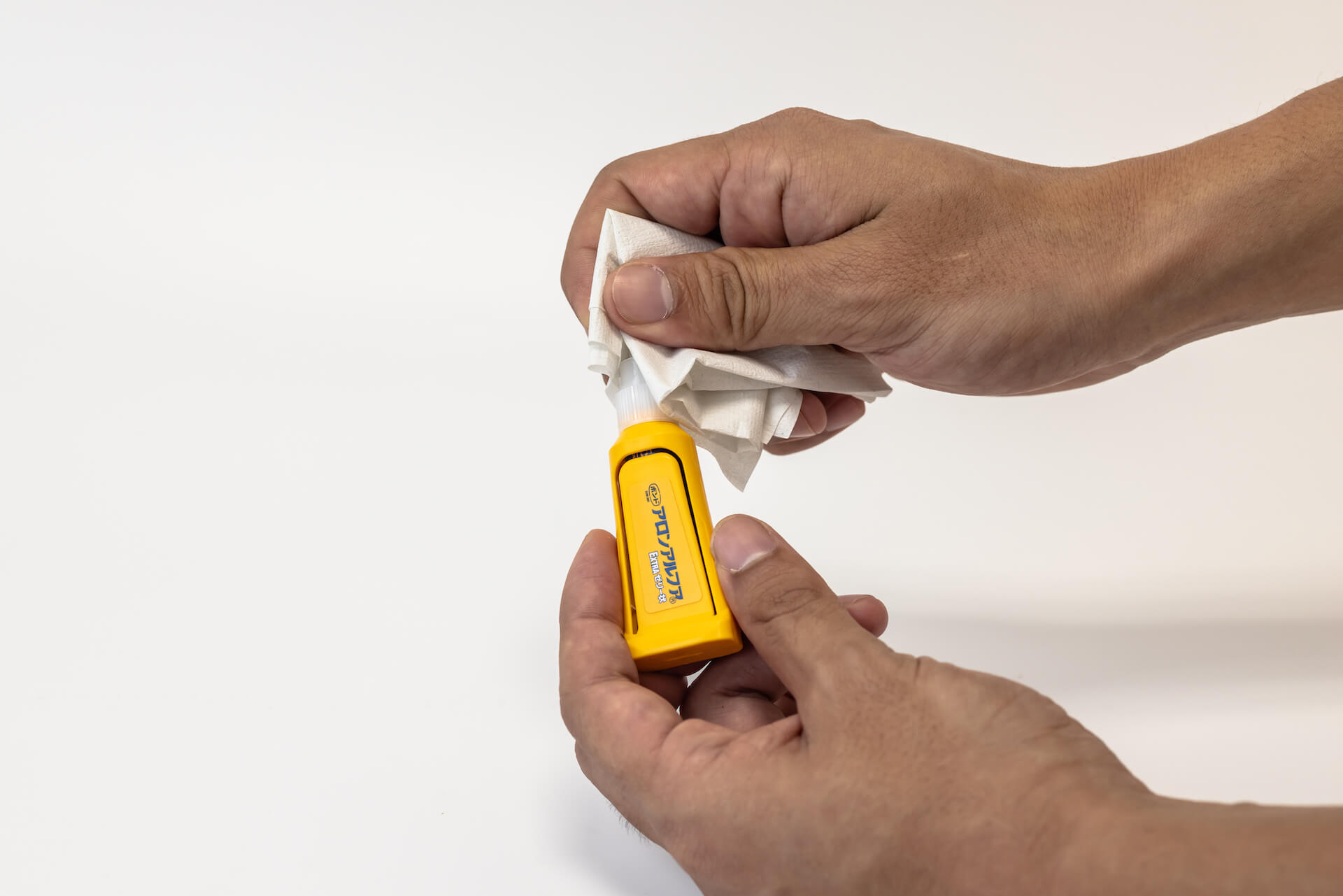 しっかり押さえることで、アロンアルフアが接着面に広がります。 はみ出した接着剤は、固まる前に、キッチンペーパーなどの硬めの紙できれいに拭き取ります。