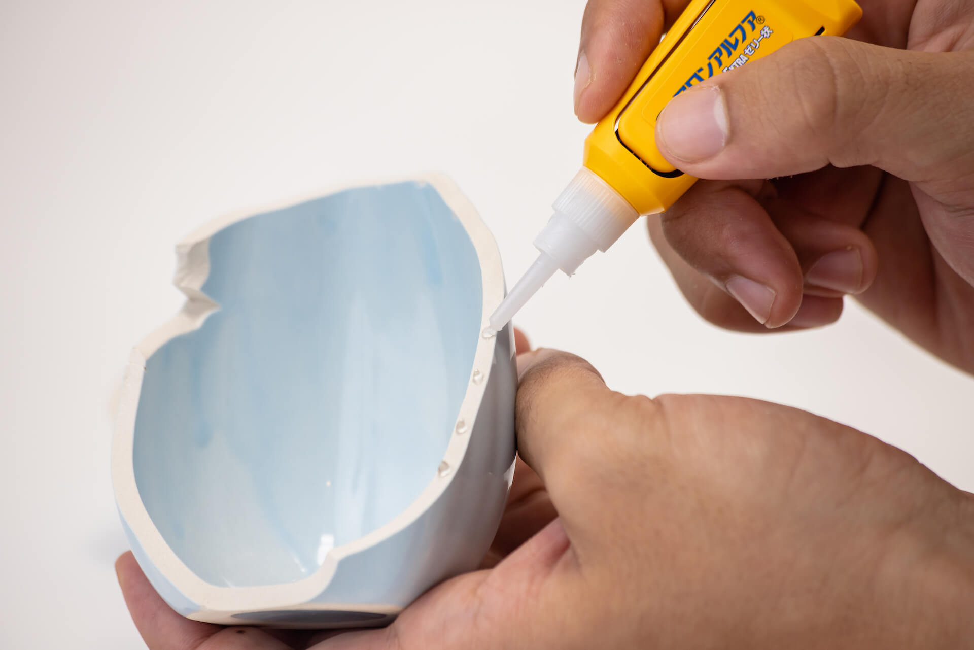 木製家具や革製品※、陶器や磁器、金属やアクリル板、プラスチックなど、さまざまなものに利用することができるゼリー状のアロンアルフア。 ※EXTRAゼリー状、プロ用速効ゼリー状のみ ここでは、割れた陶器を実際に接着しながら、使い方をご紹介します。
