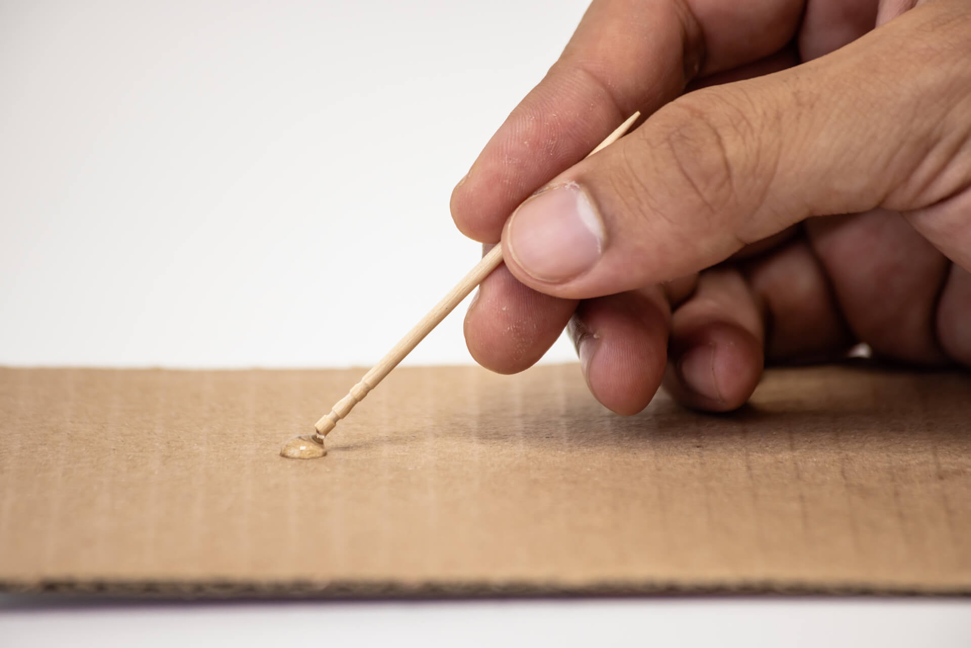 ゼリー状の接着剤を細かいところに塗りたい場合、段ボールや紙の上に接着剤を多めに出してクリップやつまようじの先端で塗ると、はみ出さずに塗布することができます。