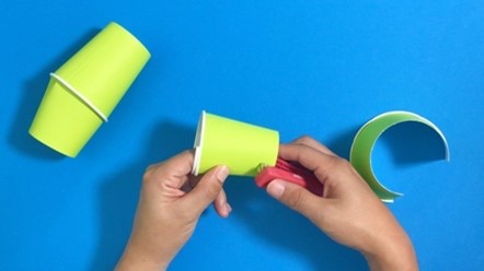紙コップの側面を1cm空けて、5-1で作ったパーツをホッチキスで留めます。