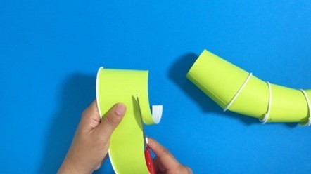 次に、紙コップ6個分の底部分を切り取って、ティラノサウルスの体のパーツを作ります。