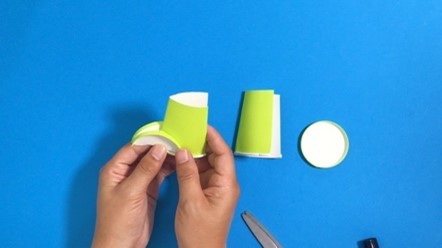 紙コップの側面を半分にカット。底面も半分にカットして、折り畳んだ側面のパーツの両端に貼り付けます。
