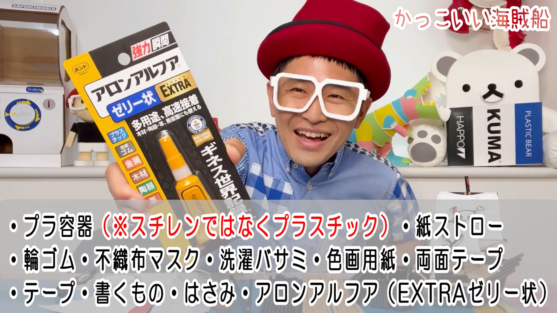 「アロンアルフア EXTRAゼリー状」なら、普通の接着剤じゃ接着しづらい素材も簡単に接着できるロン!いろいろな素材を使って夏休みの工作を楽しんでね♪
