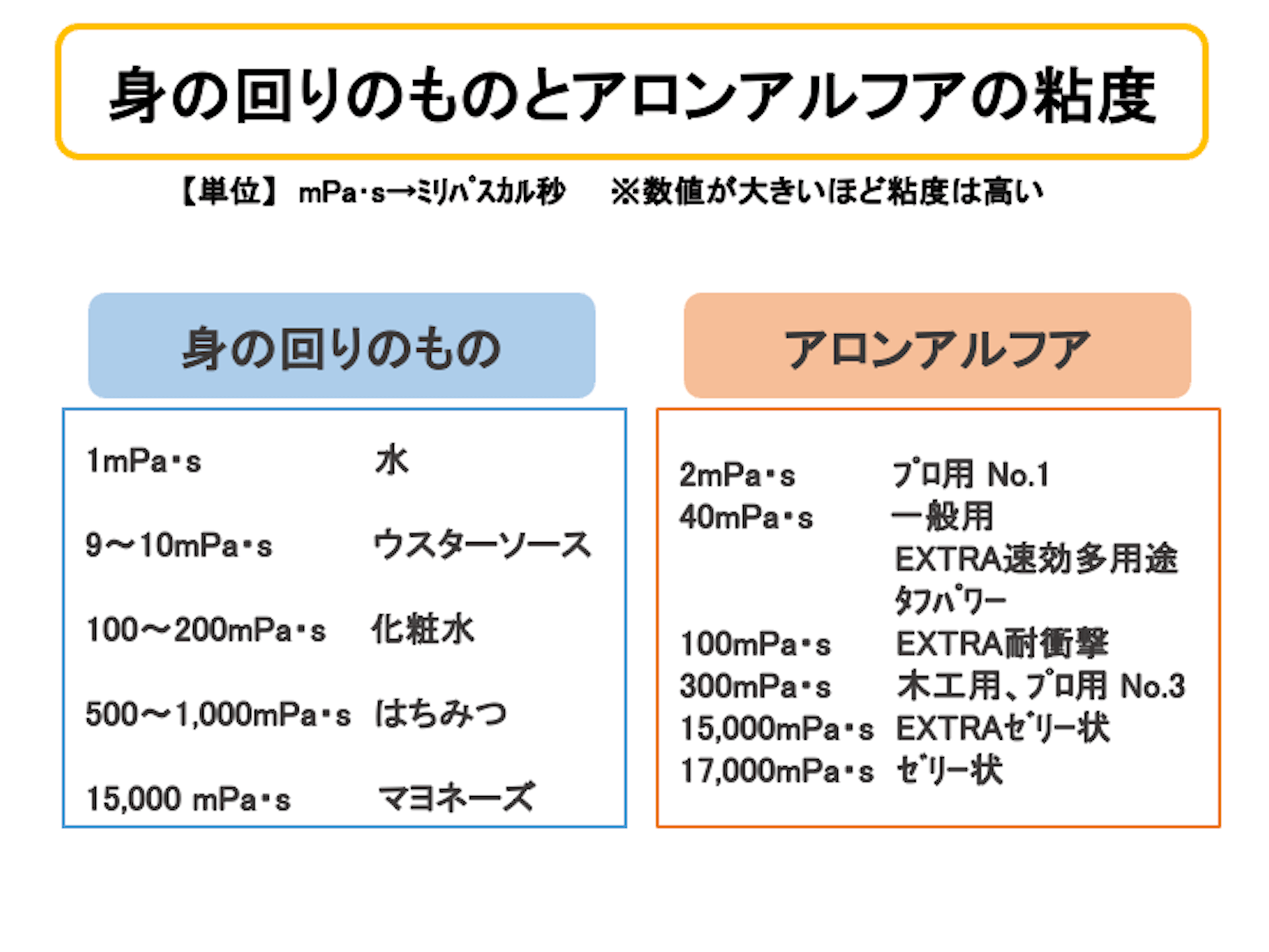 一般に接着剤では、1~50m㎩・sが低粘度、50~500m㎩・sが中粘度、500m㎩・s以上が高粘度に分類されます。下の表に記載されている粘度を確認すると、アロンアルフアは低粘度・中粘度・高粘度それぞれのタイプがある、ということが分かりますね。