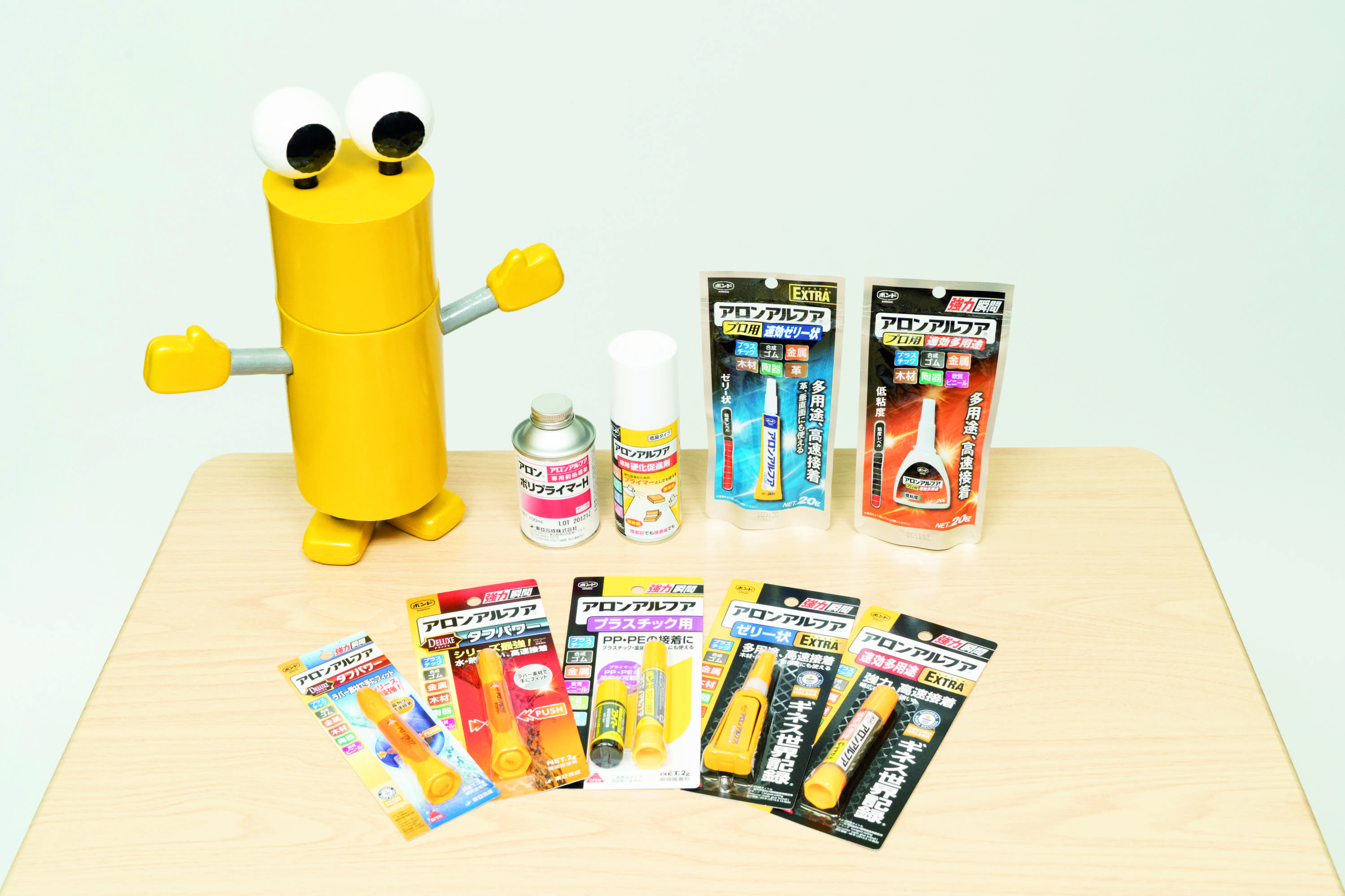 なお、プラスチック用の付属プライマーか業務用の「アロンポリプライマーH」で前処理をすれば、タフパワー・プラスチック用・プロ用速効多用途・プロ用速効ゼリー状のいずれでも接着できます。