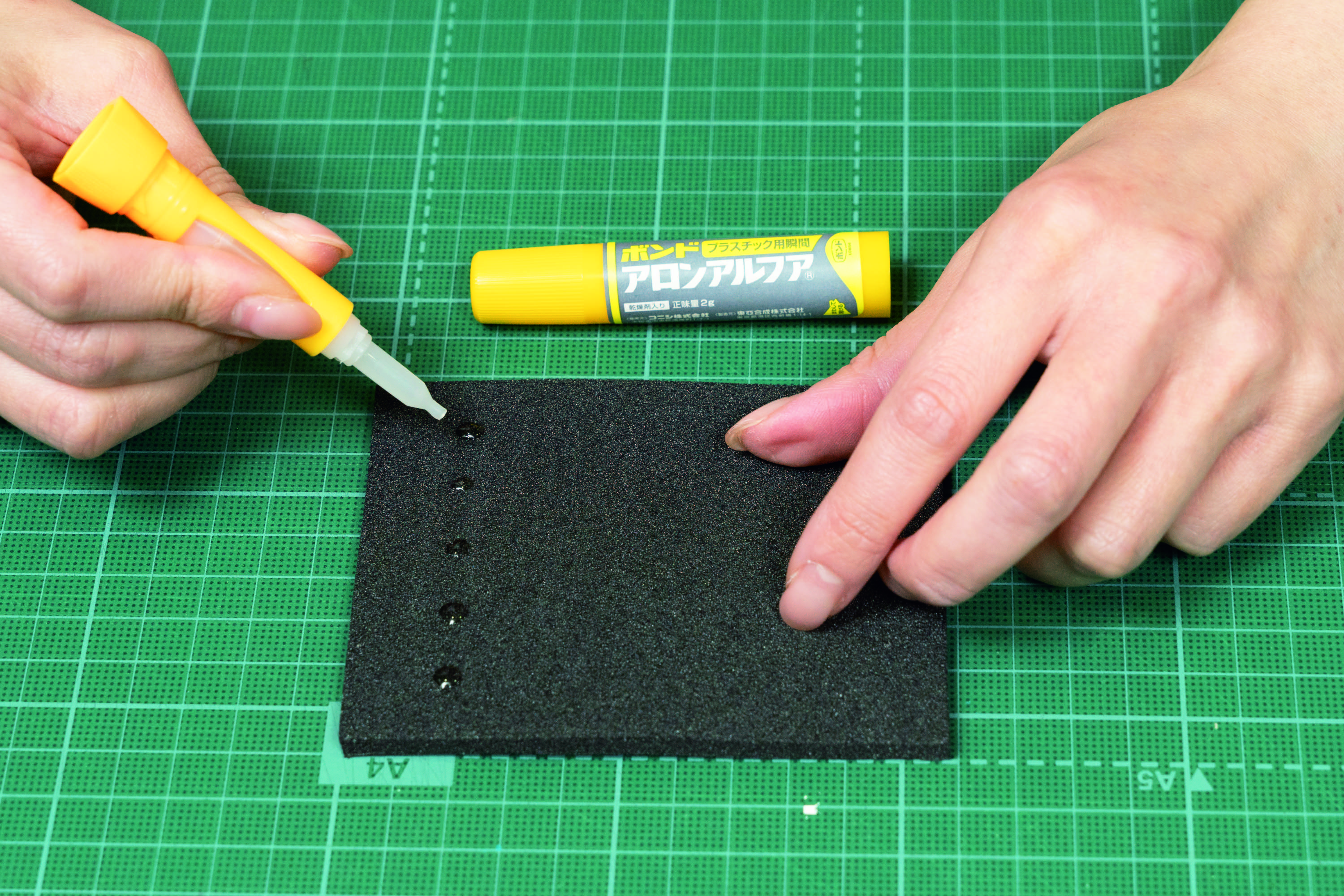 付属のプライマーを綿棒で均等に塗って5分待ち、点状にアロンアルフアを塗布して貼り合わせれば接着完了です。