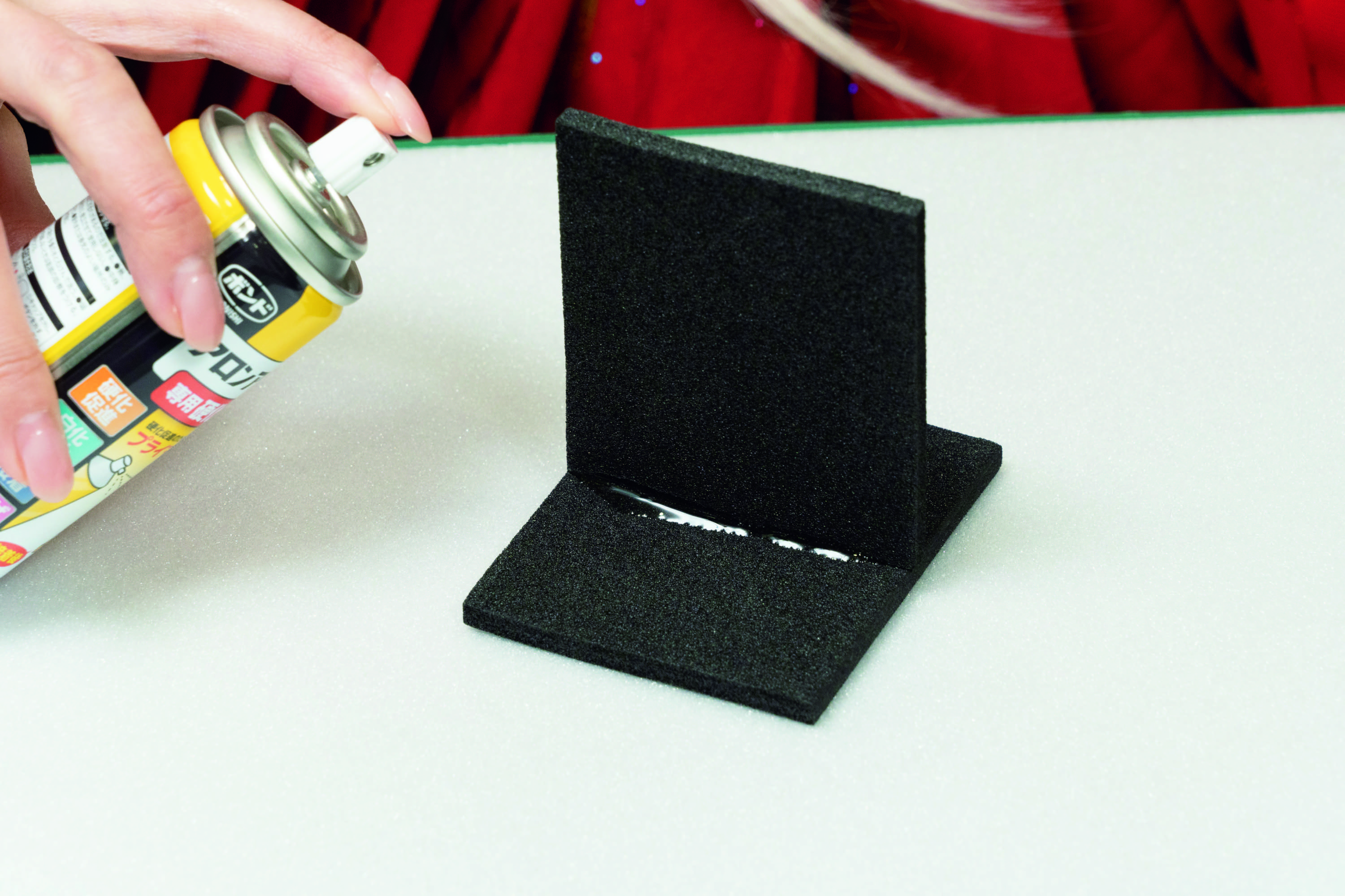 硬化促進剤をスプレーすると、貼り合わせた瞬間に接着完了するので、作業効率が上がるとともに、白化現象も防げて出来上がりもキレイ。