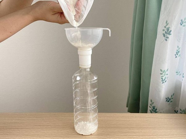 風船に小麦粉を入れるために、まずは漏斗を使ってペットボトルに小麦粉を入れます。このとき使う漏斗の口が狭いと小麦粉が詰まってしまうため、大きめサイズを使うか、カットしたペットボトルを漏斗として使用するのもおすすめです。