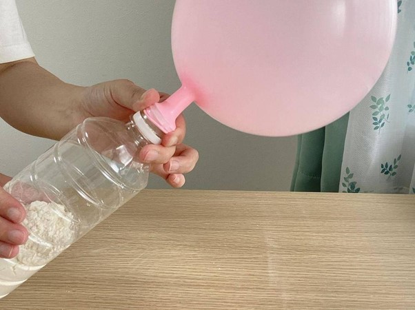 ペットボトルから風船に小麦粉を移します。こぼれないように少しずつ入れていくのがコツです。ペットボトルを風船から離した後、小麦粉が最後まで風船本体に入るよう、箸などで押し込みましょう。