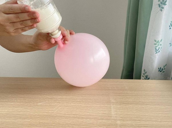 風船いっぱいに小麦粉が入ったら、ペットボトルから外します。