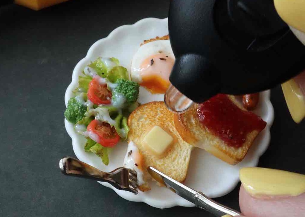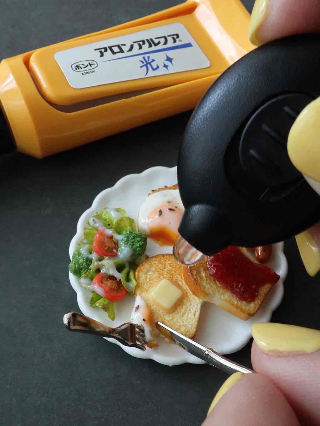 例えば、ナイフやフォークのような小さな金属パーツをミニチュアパンに取り付ける際には、通常の接着剤では硬化を待つ間にパーツが倒れてしまうことがよくあります。しかし、「アロンアルフア 光」を使用すると、ライトを照射するだけで数秒で動かなくなるため、長時間保持する必要がありません。