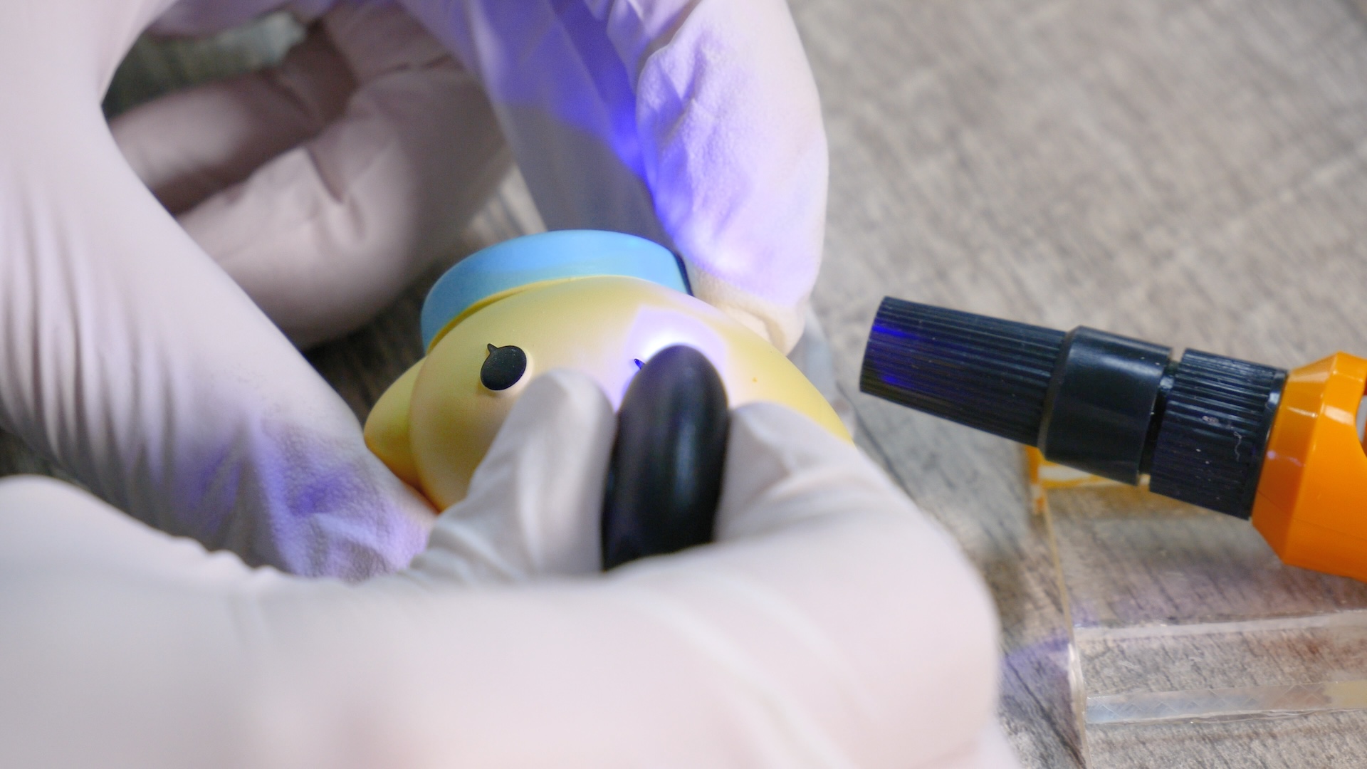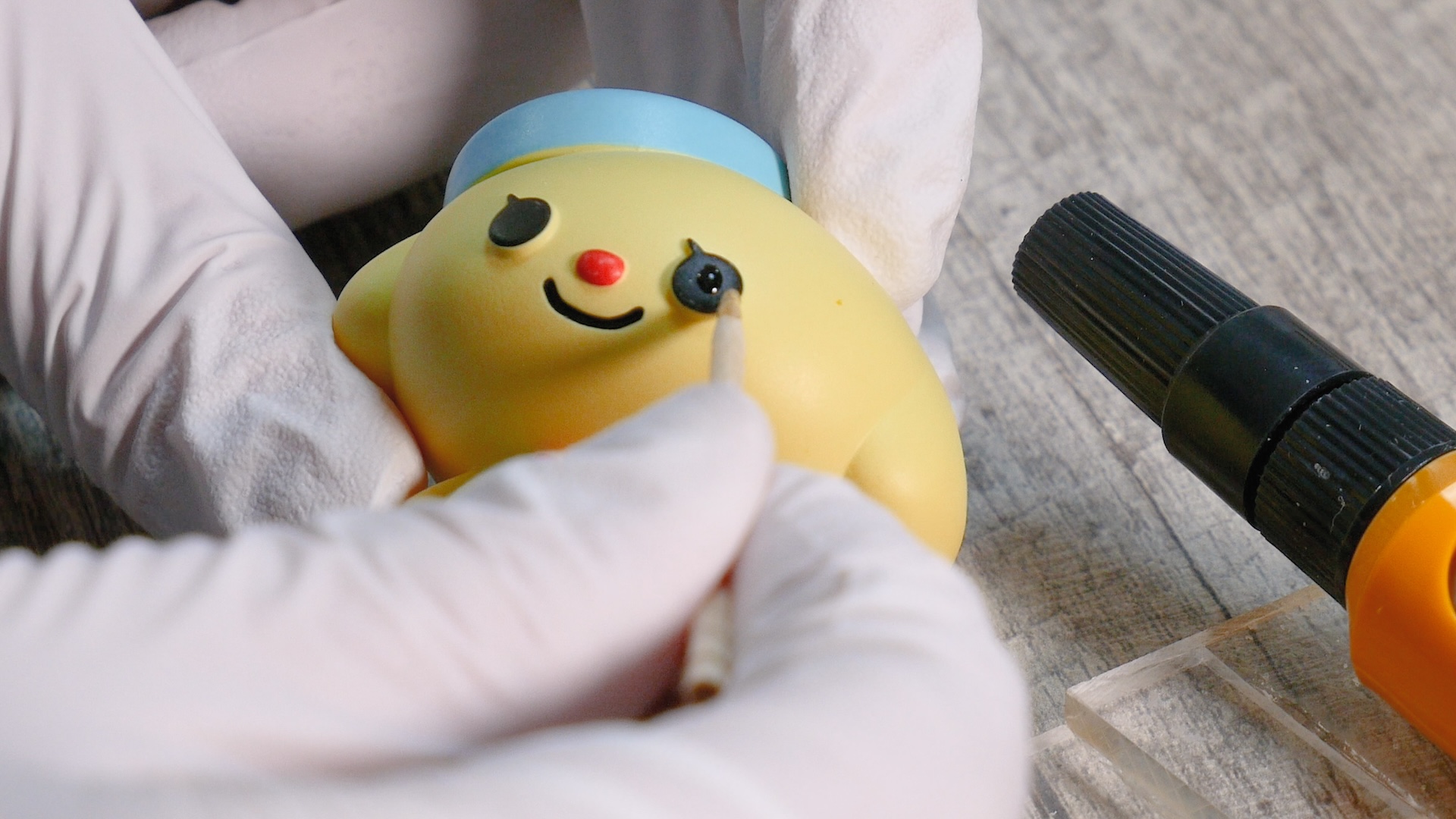 装飾部分や目などのデティールを強調するため、 「アロンアルフア 光」 を使ってぷっくりさせることもできます。専用ライトを使って透明ですぐ固まるという長所を活かした、「アロンアルフア 光」ならではの活用テクニックです。