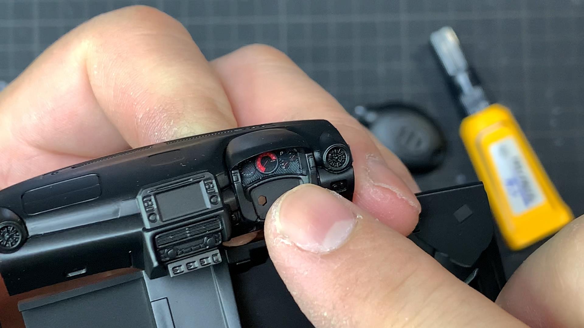 「アロンアルフア 光」は少量でも高い接着力を発揮します。爪楊枝などの道具を使って接着剤を塗布すれば、微細なパーツの接着もスムーズに。この特性は、エッチングパーツやスピードメーターの加工などの精密さが求められる作業で非常に役立ちます。