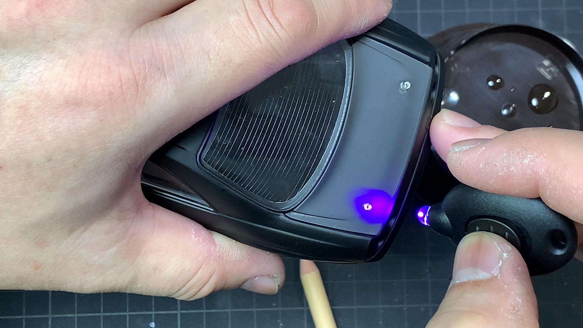 接着部分に付属のライトを当てます。5cm程度の距離を保ちながら、約10秒間照射することで硬化が完了します。光が当たらないところは、通常のアロンアルフアと同様に水分により硬化します。