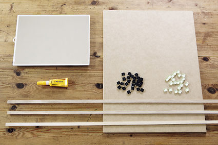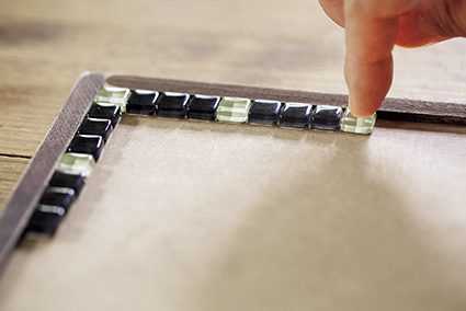 ① 貼る前に、鏡、外枠、内枠、タイルを背板に並べ、完成イメージを確認!