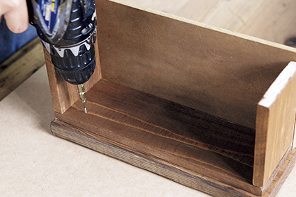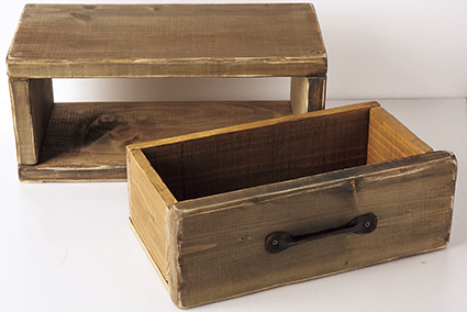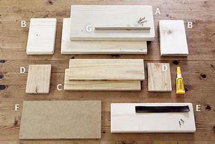 ① A、Bで枠を作る。引き出しはC1枚にD、Fを接着し、Cの前面にEをつける。次にもう1枚のCを固定。本体と引き出しは25mmの木ネジで固定。取っ手は12mmの木ネジで。本体のネジ穴はGを埋めて処理。