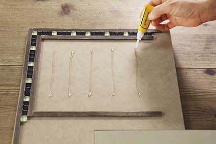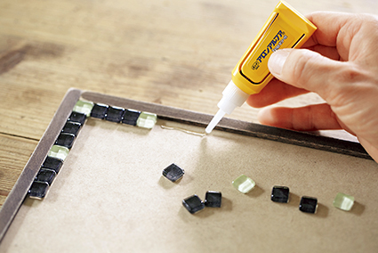 ④ 背板の中央に「アロンアルフア」を線状に塗り、鏡を接着。タイルを貼ったときと同様に、押さえて圧着する。鏡が汚れないように。