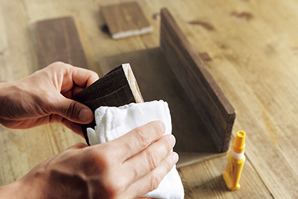 ② 水分との反応で固まる「アロンアルフア」の性質を生かし、木口(こぐち)を水拭きすると接着速度が速まり、きれいに。
