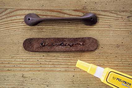 ② 背板に「アロンアルフア」を線状または点状につける。10円玉1個分の面積に1滴が目安。
